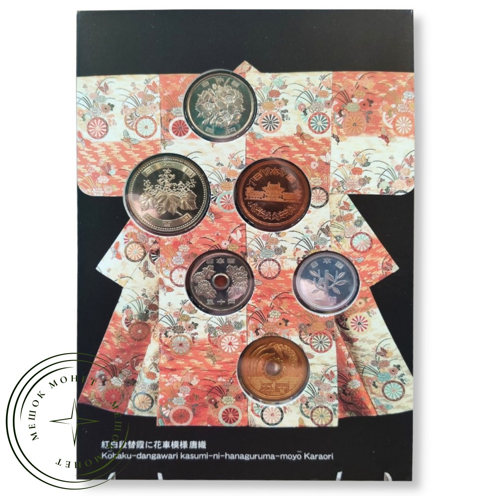 В наборе 6 стандартных японских обиходных монет: 1, 5, 10, 50, 100 и 500 йен.