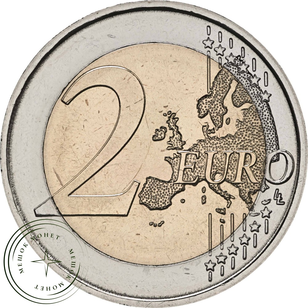 На аверсе монеты изображен стандартный европейский вариант, используемый с 2007 года, на котором представлена карта Европы без национальных границ. Как и на всех немецких памятных монетах номиналом 2 евро, на ребре монеты выгравирована надпись «ЕДИНСТВО, СПРАВЕДЛИВОСТЬ И СВОБОДА» и стилизованный федеральный орел.