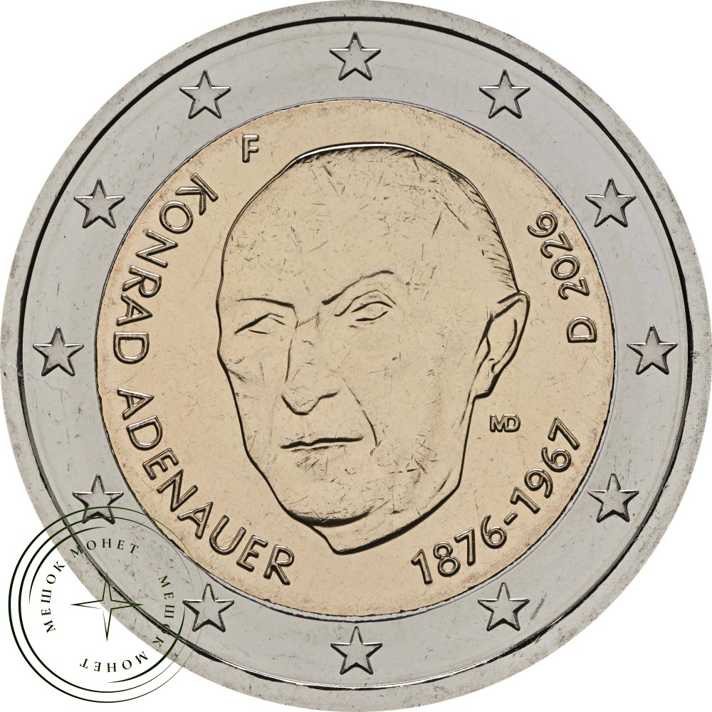 На национальной стороне монеты изображен впечатляющий портрет Конрада Аденауэра в три четверти. Его подпись и даты рождения и смерти (1876–1967) вписаны во внутреннюю часть круга монеты. В верхней части указан код страны «D» для Германии, год «2026» и знак монетного двора (A, D, F, G или J). В нижней половине находится подпись берлинской художницы Марианны Диц. Внешнее кольцо украшено двенадцатью звездами европейского флага.