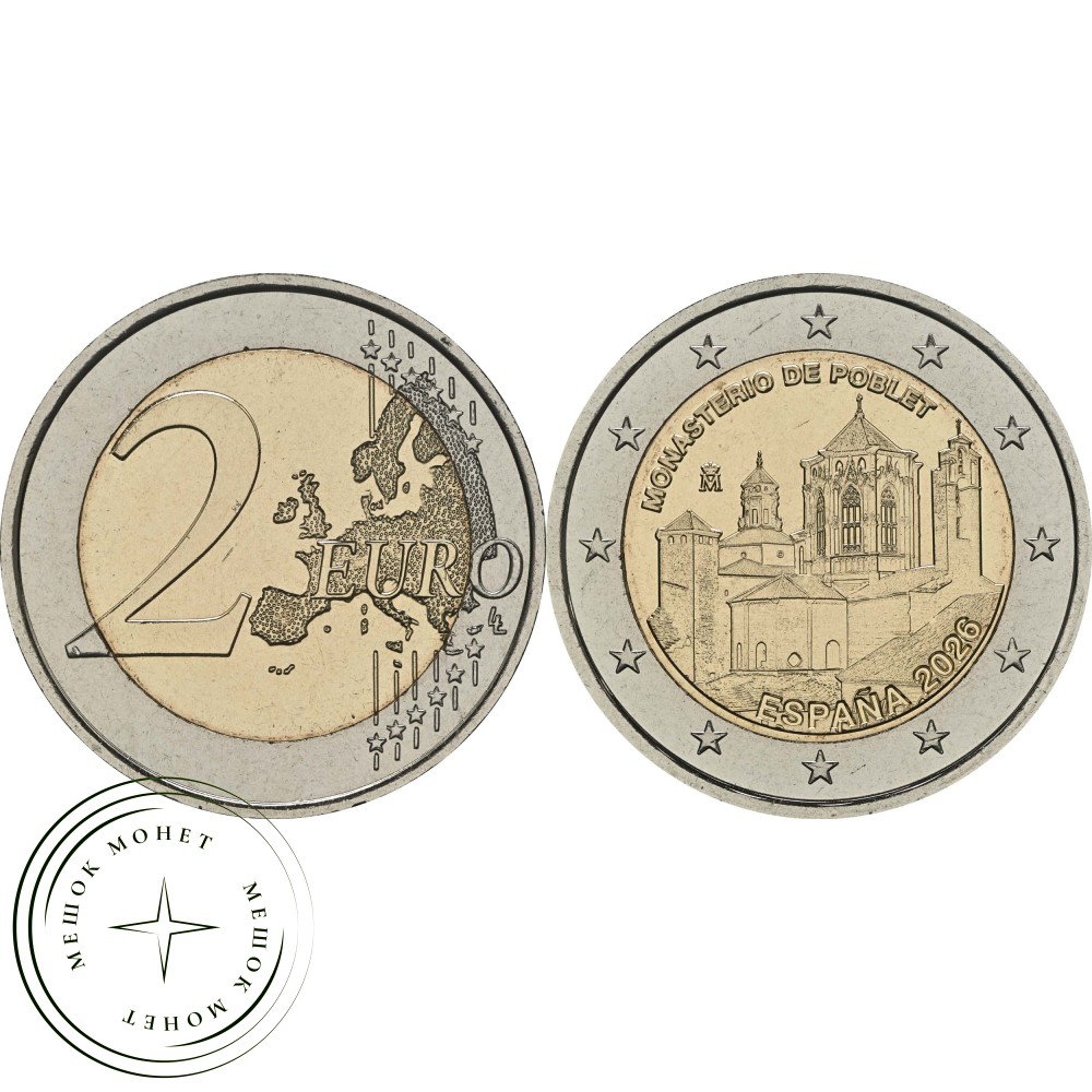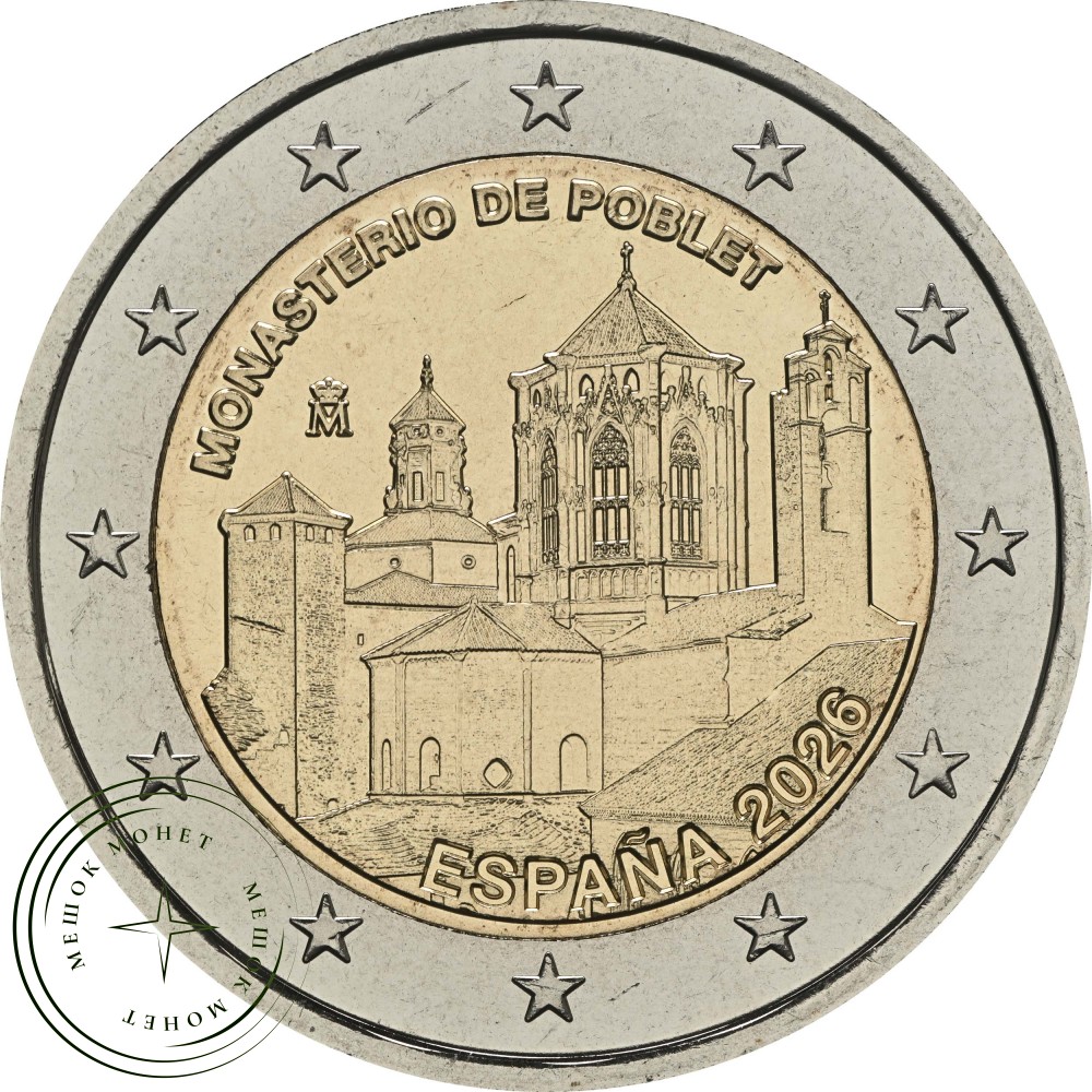 В верхней части изображения расположена надпись «ESPAÑA». Ниже указан год 2026 и монограмма Королевского монетного двора Испании с коронованной буквой М. На внешнем кольце изображены двенадцать звезд Европейского союза, и монета «2 евро 2026 года» из монастыря Клостер Поблет органично вписывается в привычный дизайн монет номиналом 2 евро, выпущенных в рамках ЕС.