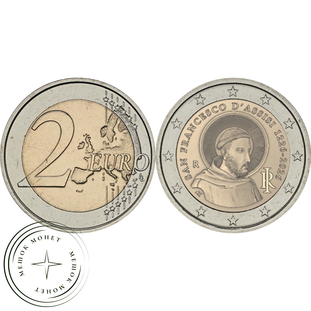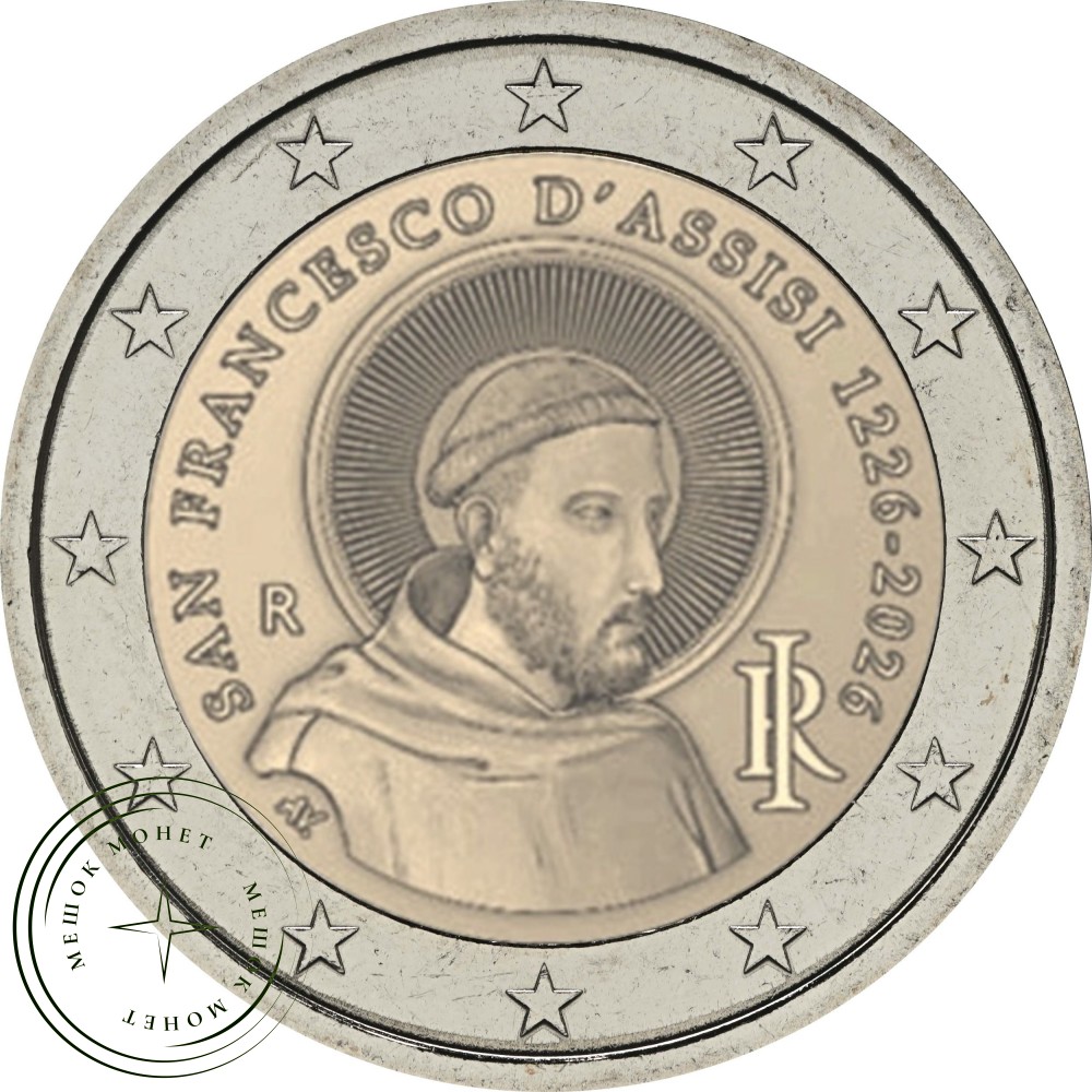 Вдоль края изображения расположена надпись «SAN FRANCESCO D’ASSISI 1226–2026». В правом нижнем углу находится знак монетного двора Рима — буква R, а в левом нижнем углу — инициалы AV дизайнера Антонио Веккьо. На внешнем кольце изображены двенадцать звезд Европейского союза.