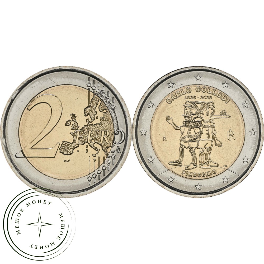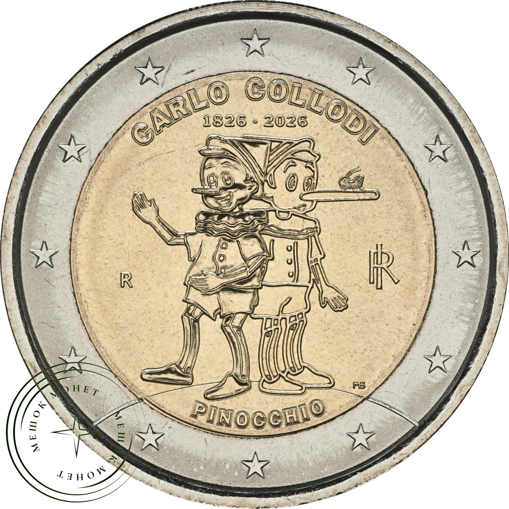 Итальянская монета номиналом 2 евро 2026 года «Пиноккио» посвящена 200-летию со дня рождения Карло Коллоди (1826–2026), автора всемирно известной сказки «Приключения Пиноккио». Этой памятной монетой Италия чествует произведение, которое долгое время являлось неотъемлемой частью европейской детской и юношеской литературы.
