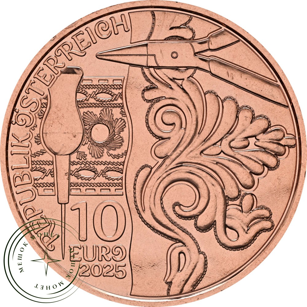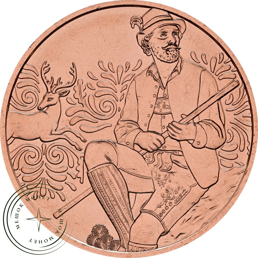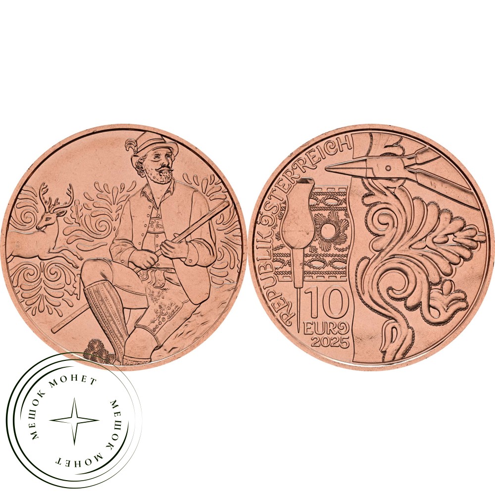 Эта монета посвящена традиционному мужскому костюму Австрии, в частности ледерхозенам. Мужчина на монете одет в классический национальный костюм: коричневые ледерхозен, красную клетчатую рубашку, зеленый жилет, вязаные гольфы и настоящую тирольскую шляпу. Его осанка гордая и уверенная, одежда выразительная. Этот традиционный костюм передает солидарность, практичность и региональную идентичность – от горных фестивалей до свадеб, от альпийских пастбищ до праздничного шатра. Изначально ледерхозен были рабочей одеждой лесников и охотников – из прочной кожи, простой в уходе, долговечной и функциональной. Со временем они стали символом мужественности, местных связей и альпийской культуры. Современные версии часто искусно декорированы и изготовлены вручную – проявление настоящего мастерства.