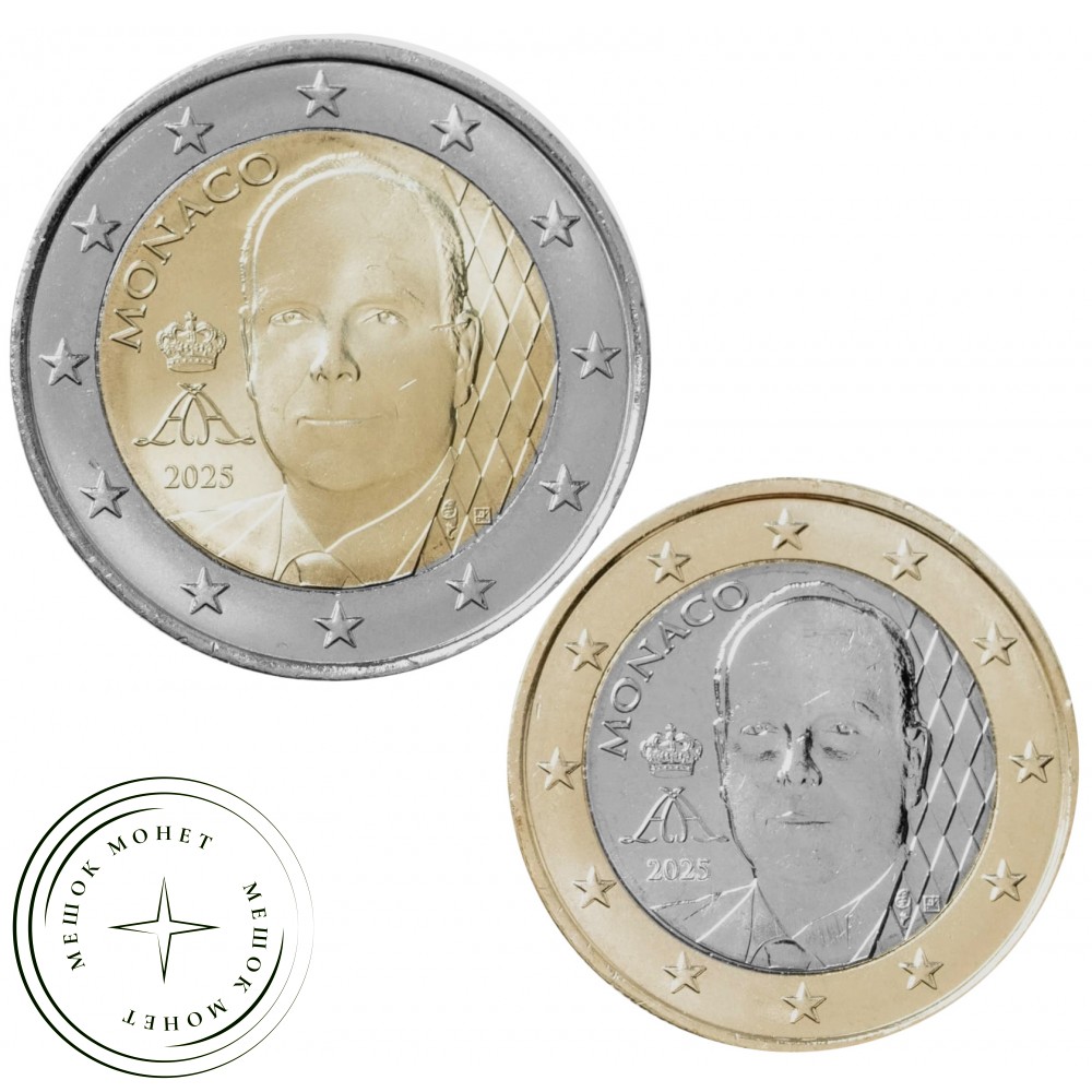 Набор 1 и 2 евро с обновлённым портретом князя Альбера II. Монеты поступили в обращение в октябре 2025 года и продолжают серию регулярных выпусков с изображениями правящего монарха.