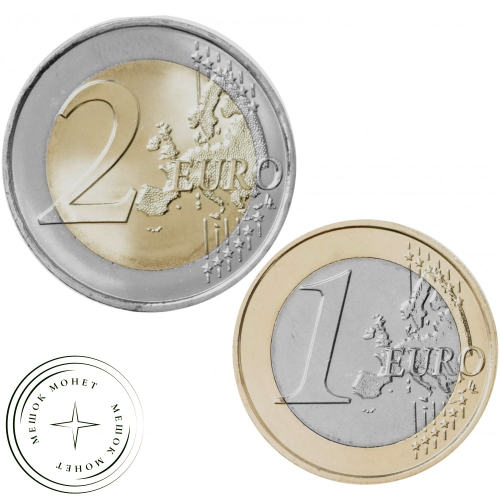 Номинал: 1 евроцент / 2 евроцента / 5 евроцентов / 10 евроцентов / 20 евроцентов / 50 евроцентов / 1 евро / 2 евро