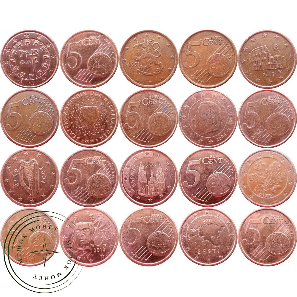 В наборе представлены 10 монет по 5 евроцентов 10 стран Евросоюза. Все монеты из обращения.
