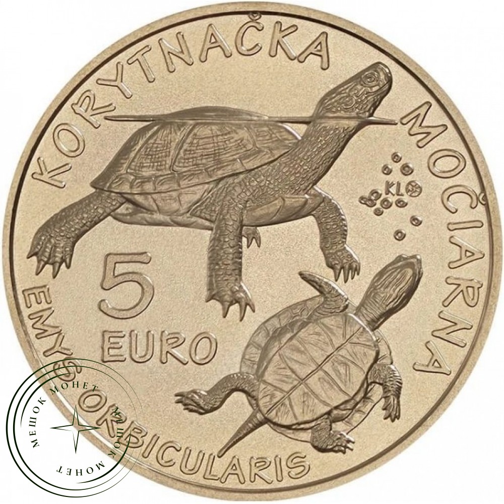 Реверс: Представлена многослойная композиция с двумя черепахами: одна находится у поверхности воды, другая — в толще воды. По кругу нанесены надписи на словацком («KORYTNAČKA MOČIARNA») и латыни («EMYS ORBICULARIS»), а слева указан номинал.
