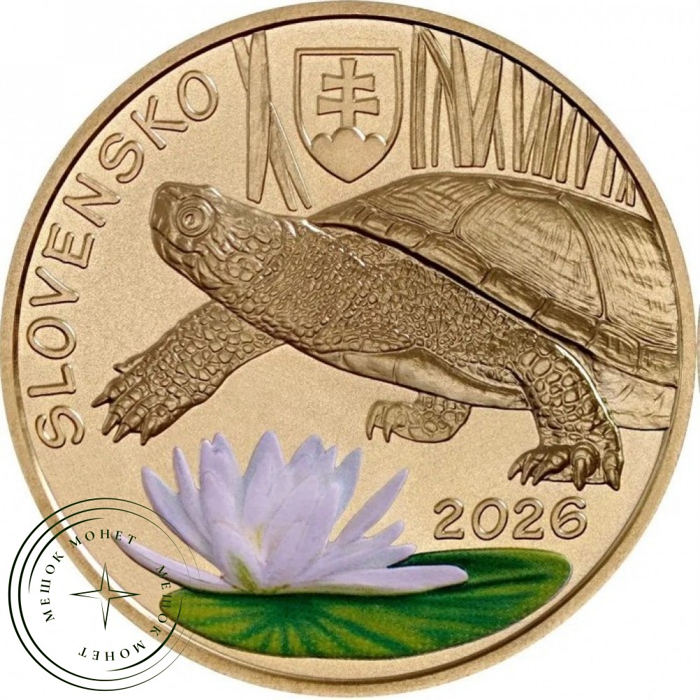Монета Словакии номиналом 5 евро, выпущенная в 2026 году, посвященная европейской болотной черепахе (Emys orbicularis) и является частью популярной серии «Флора и фауна Словакии».
