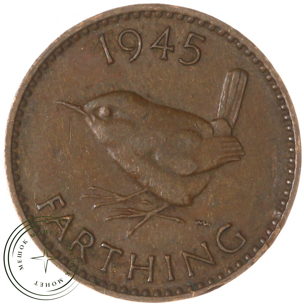 Монета Великобритании 1 фартинг 1945 года, выпущенная Королем Георгом VI, имеет диаметр 20.32 мм, массу 2.83 гр, толщину 1.30 мм и тираж 14.745.600 экземпляров. Она изготовлена из бронзы и имеет гладкий гурт. Монета была отчеканена на монетном дворе в Лондоне.