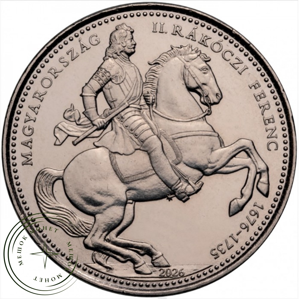 На лицевой стороне указана страна-эмитент «MAGYARORSZÁG», имя князя «II. RÁKÓCZI FERENC», годы его жизни «1676–1735» и год чеканки «2026».