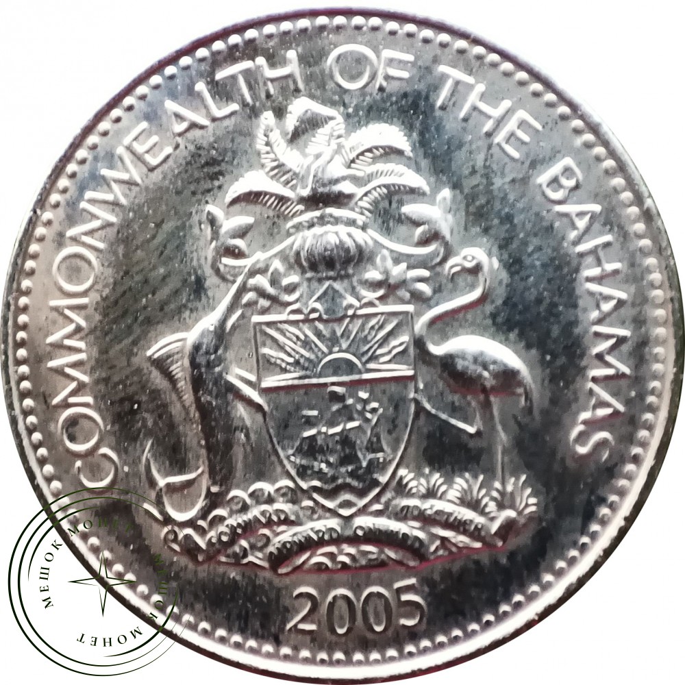 В центре аверса отчеканен государственный герб. На щите под половиной сияющего солнца изображена каравелла "Санта-Мария": этот флагман первого путешествия Христофора Колумба. Щит увенчан древним шлемом, раковина и пальмовый лист над ним означают богатую флору и фауну островов. Щит поддерживают марлин (слева), рыба из отряда окунеобразных, и фламинго (справа), типичные обитатели Багам и местного моря. На ленте в нижней части герба находится национальный девиз: Вперёд, выше и дальше — вместе.