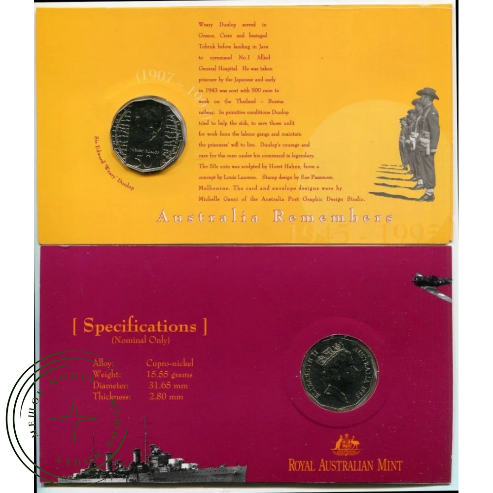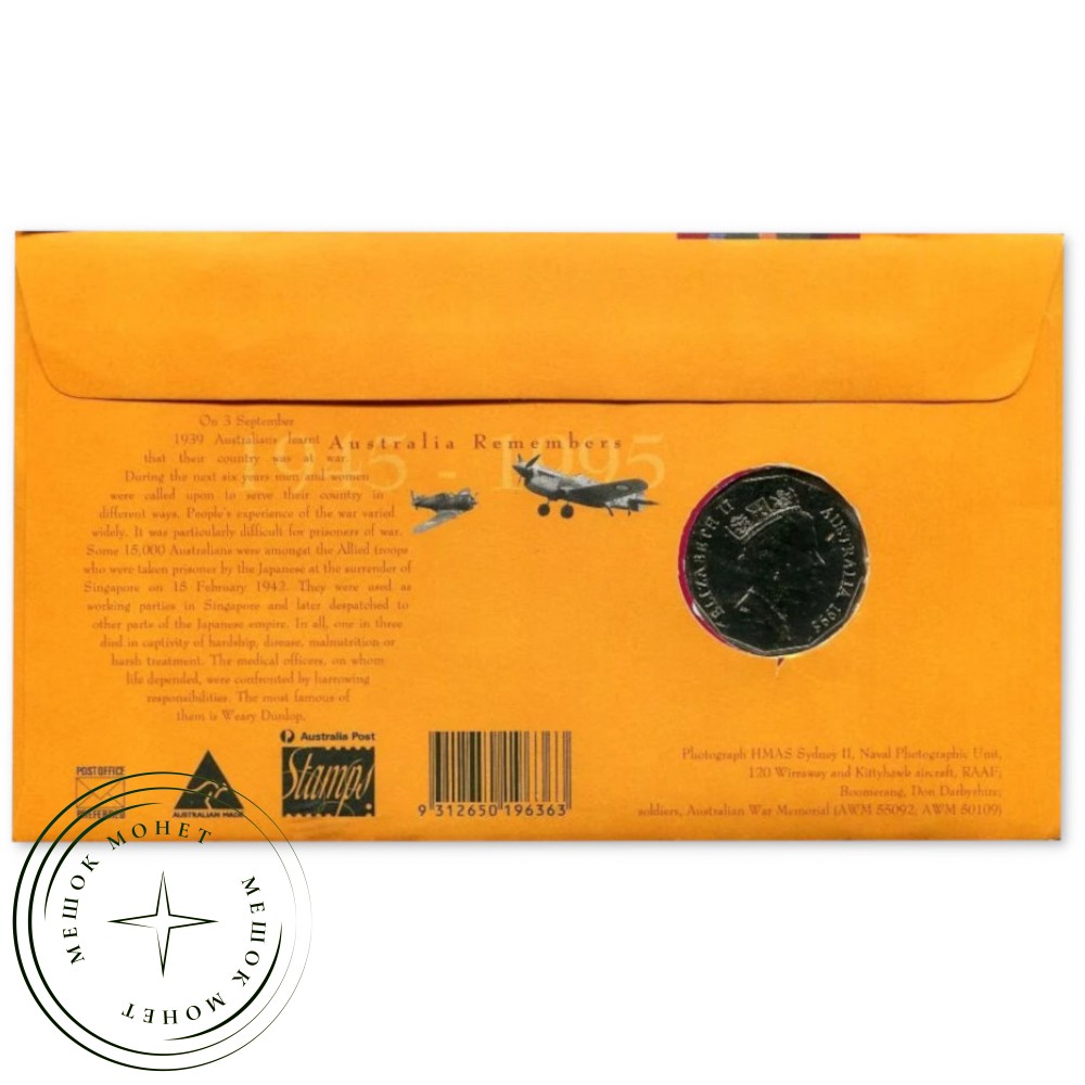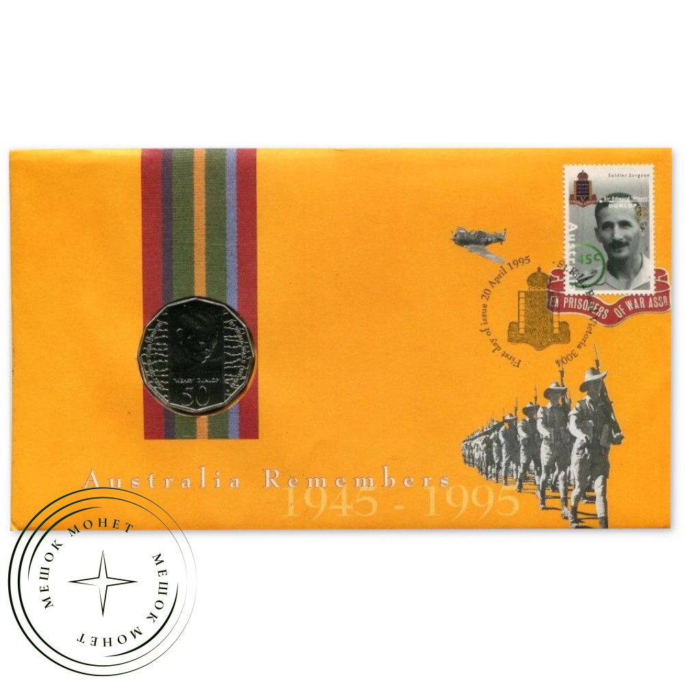 Почтово-нумизматический конверт (PNC), выпущенный в Австралии в 1995 году. Этот коллекционный набор «Австралия помнит 1945–1995» (Australia Remembers 1945–1995) посвящен 50-й годовщине окончания Второй мировой войны и памяти военнопленных.