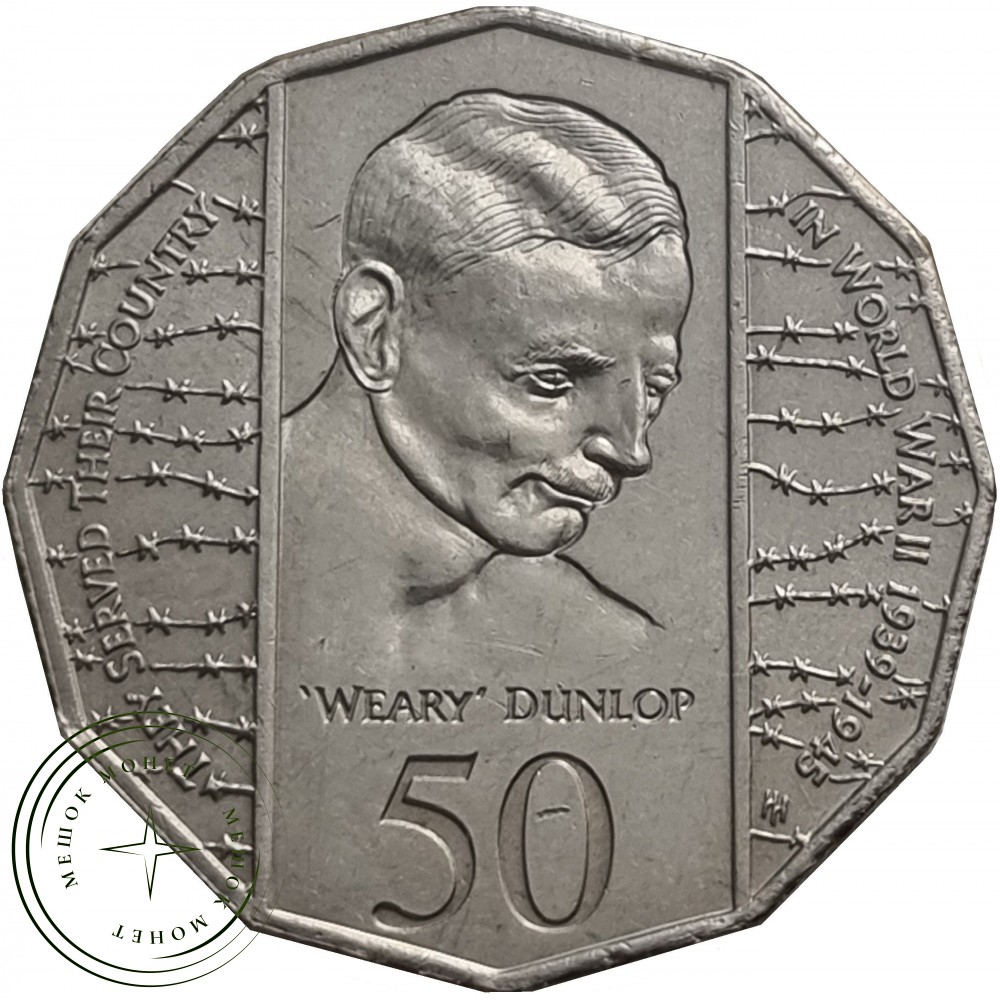 Монета: Памятные 50 центов, на которых изображен сэр Эдвард «Уири» Данлоп (Sir Edward "Weary" Dunlop) — легендарный австралийский хирург, прославившийся своей заботой о сослуживцах в японском плену.