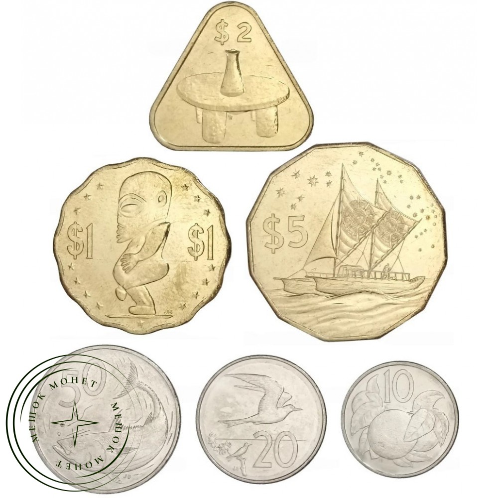 5 долларов: Монета многоугольной формы с 12 гранями. На реверсе изображено традиционное полинезийское двухкорпусное парусное каноэ — Вака Моана (Marumaru Atua) под парусами.