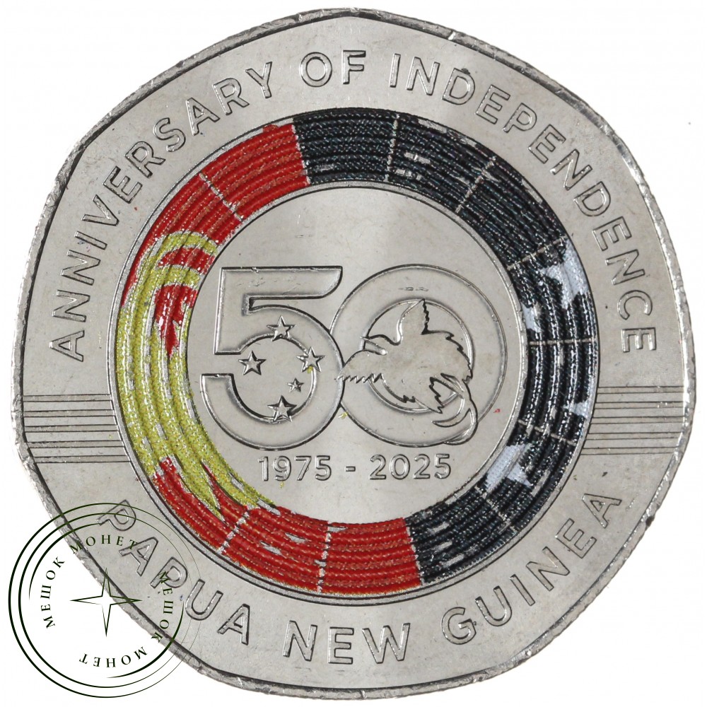 Лицевая сторона: На ней отмечена "50th ANNIVERSARY OF INDEPENDENCE" (50-летие независимости) с указанием годов "1975-2025" и надписью "PAPUA NEW GUINEA". В центре изображено число "50" с элементами национального орнамента и флага.