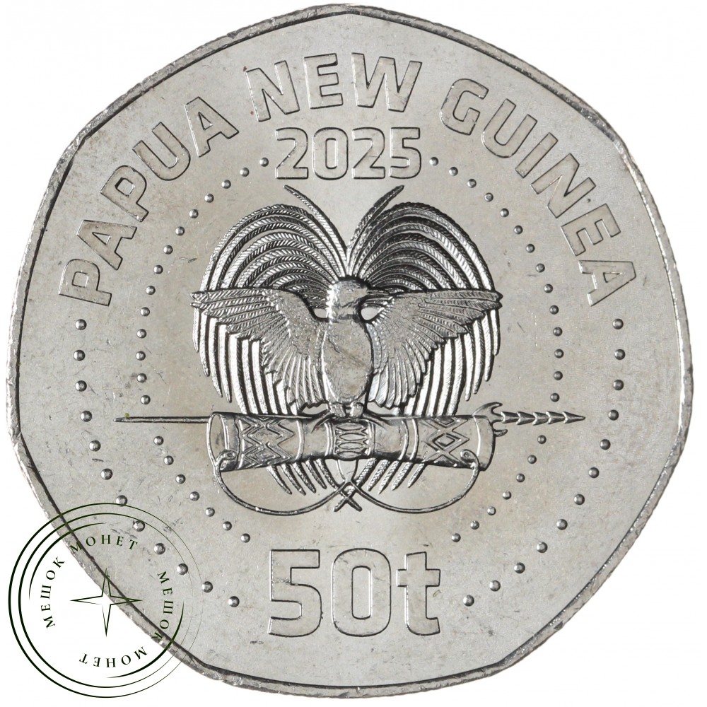 Оборотная сторона: На ней указан год "2025" и надпись "PAPUA NEW GUINEA", а также изображена райская птица, являющаяся национальным символом, и номинал "50t" (50 тоэ).