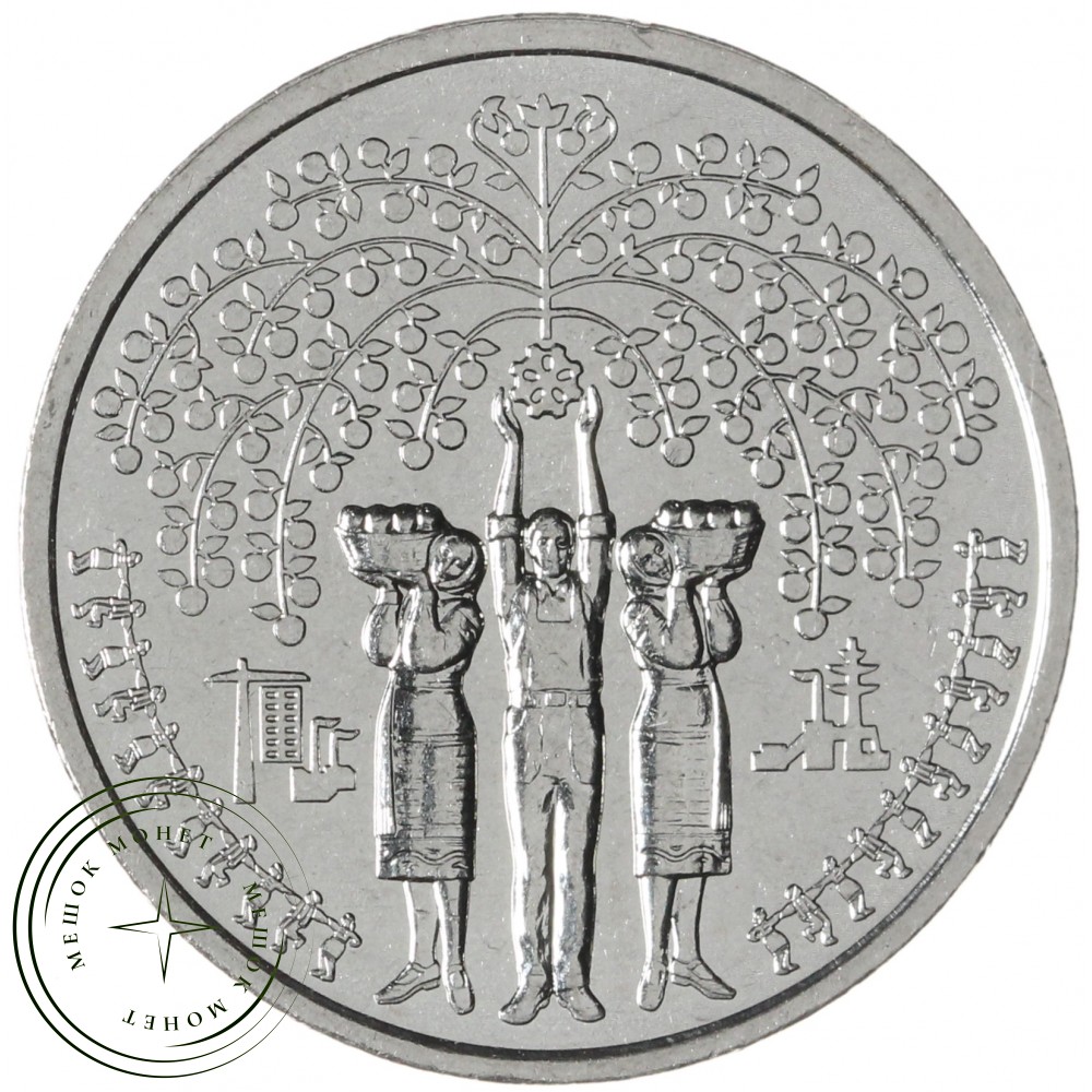 Реверс монеты: Центральная часть монеты украшена изображением трёх людей — двух женщин и одного мужчины, стоящих под ветвями дерева, усыпанного плодами. Это дерево символизирует плодородие, жизнь и процветание.