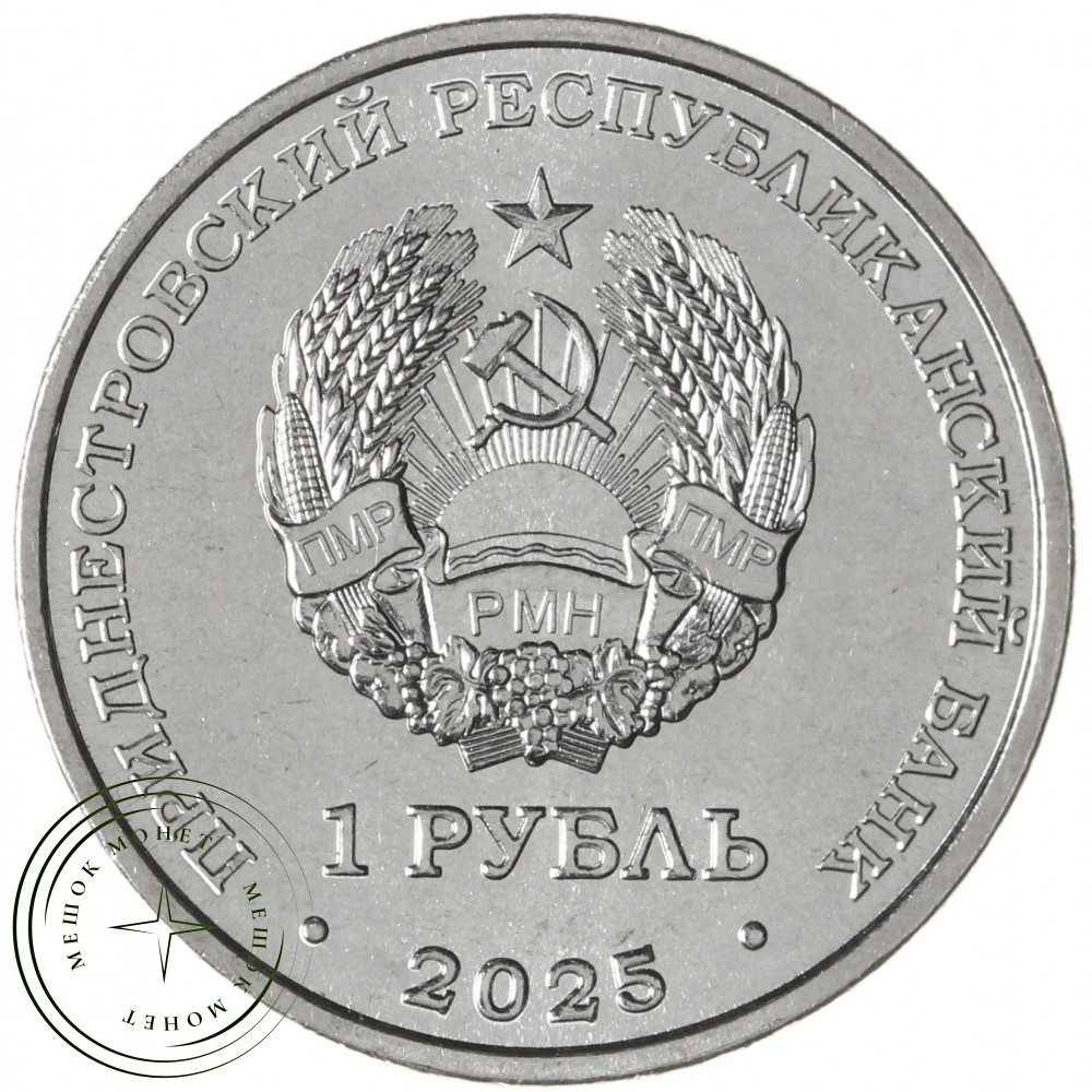 Аверс монеты: в центре – изображение Государственного герба Приднестровской Молдавской Республики, в нижней части под гербом – номинал «1 РУБЛЬ»; по кругу – надписи: вверху – «ПРИДНЕСТРОВСКИЙ РЕСПУБЛИКАНСКИЙ БАНК», внизу – год выпуска «2025».