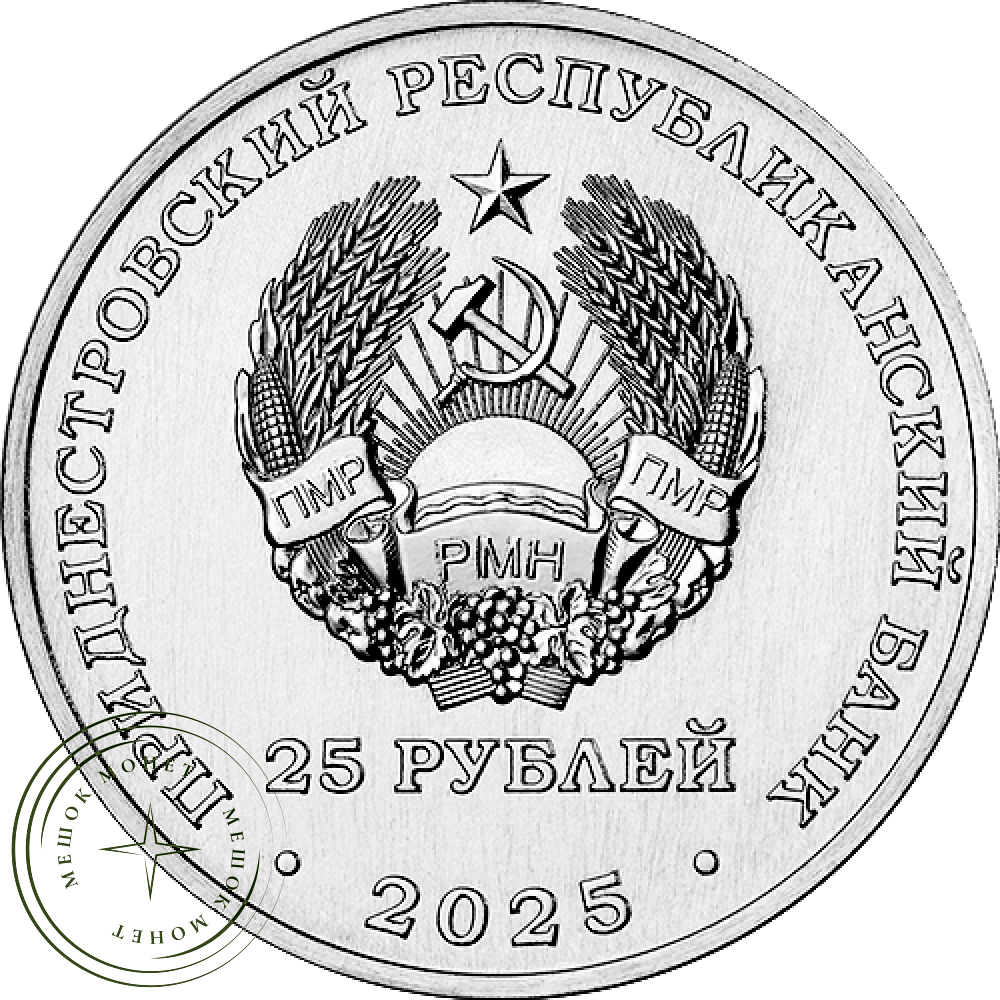 в центре – изображение Государственного герба Приднестровской Молдавской Республики; в нижней части под гербом – номинал «25 РУБЛЕЙ»; по кругу – надписи: вверху – «ПРИДНЕСТРОВСКИЙ РЕСПУБЛИКАНСКИЙ БАНК», внизу – год выпуска «2025».