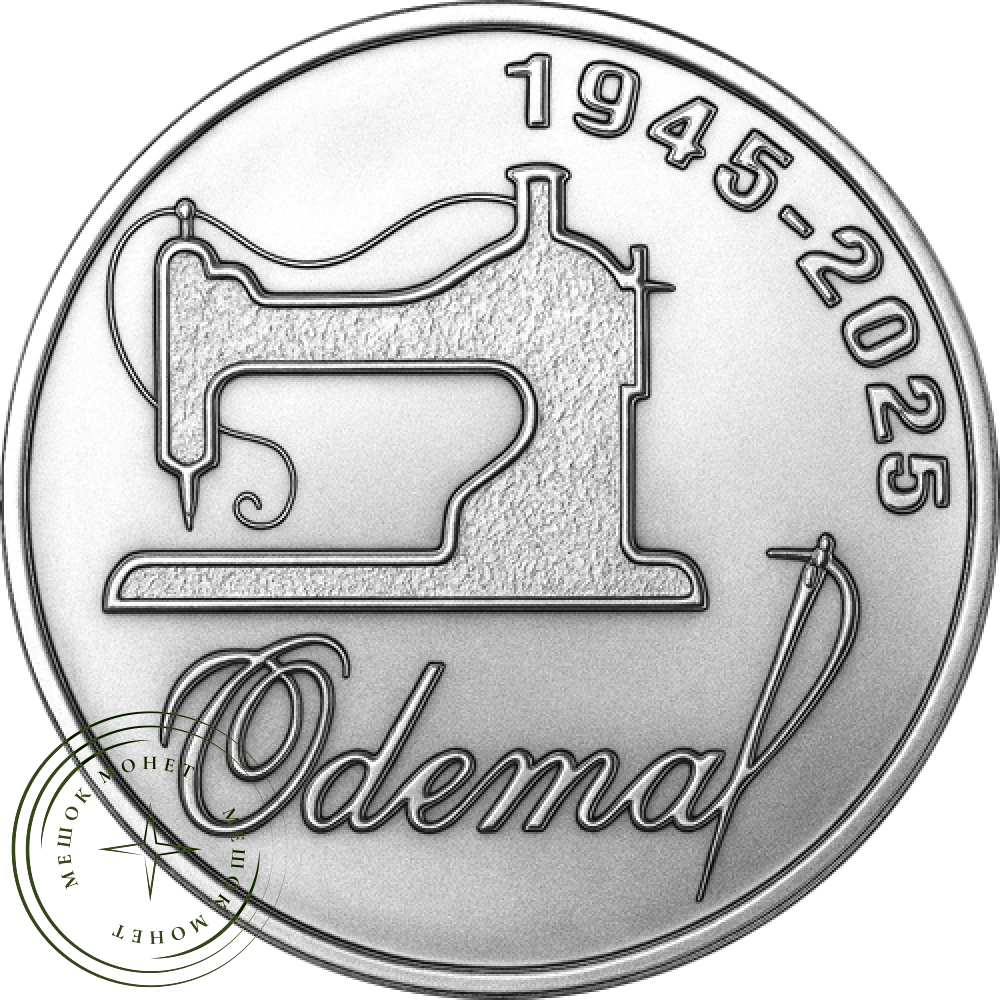 в центре – стилизованное изображение швейной машинки; внизу – надпись «Одема», повторяющая стилистику логотипа предприятия; вверху справа по кругу – годы «1945-2025».