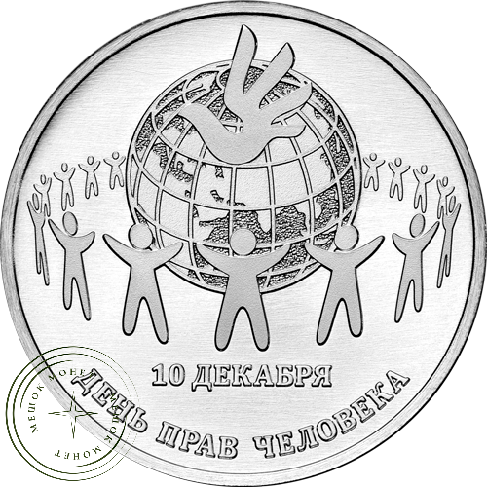 в центре – стилизованное изображение планеты Земля и логотипа прав человека, сочетающего в себе изображение руки и птицы, в окружении взявшихся за руки людей, ниже – надпись «10 ДЕКАБРЯ»; внизу по кругу – надпись «ДЕНЬ ПРАВ ЧЕЛОВЕКА».