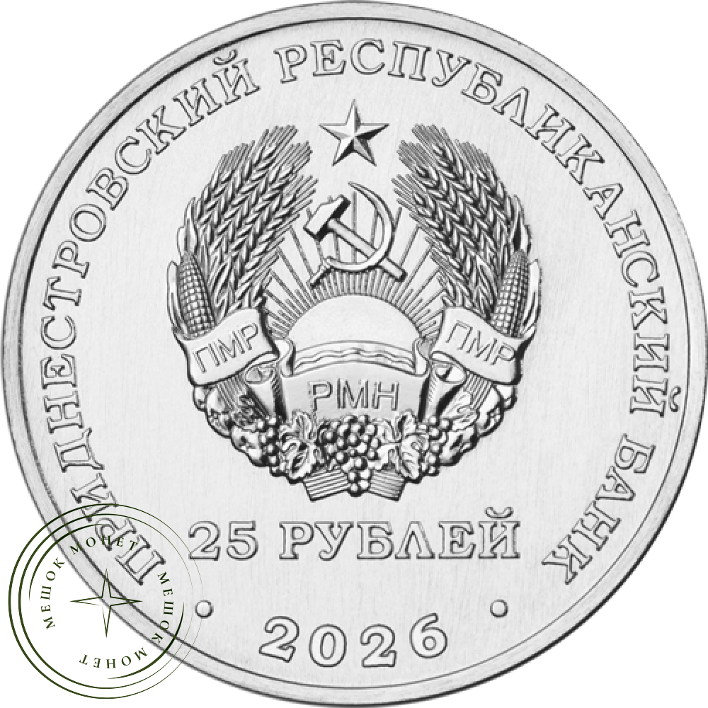 в центре – изображение Государственного герба Приднестровской Молдавской Республики, в нижней части под гербом – номинал «25 РУБЛЕЙ»; по кругу – надписи: вверху – «ПРИДНЕСТРОВСКИЙ РЕСПУБЛИКАНСКИЙ БАНК», внизу – год выпуска «2026».