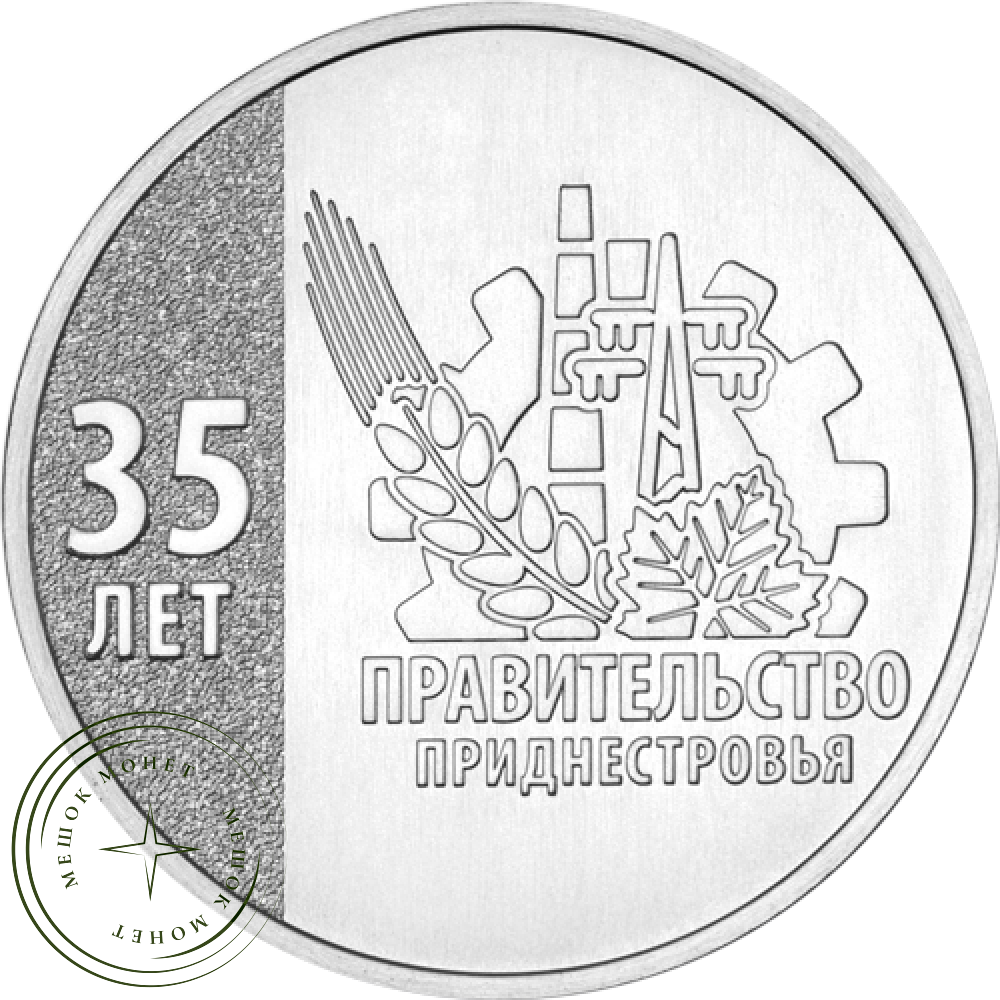 справа – рельефное изображение эмблемы Правительства ПМР; слева – надпись в две строки «35 ЛЕТ».