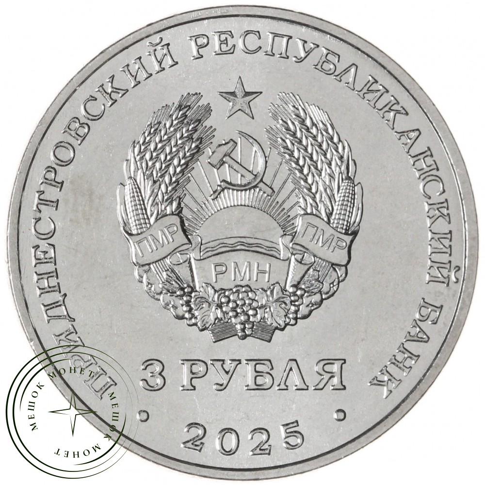 Аверс монеты: в центре – изображение Государственного герба Приднестровской Молдавской Республики, в нижней части под гербом – номинал «3 РУБЛЯ»; по кругу – надписи: вверху – «ПРИДНЕСТРОВСКИЙ РЕСПУБЛИКАНСКИЙ БАНК», внизу – год выпуска «2025».