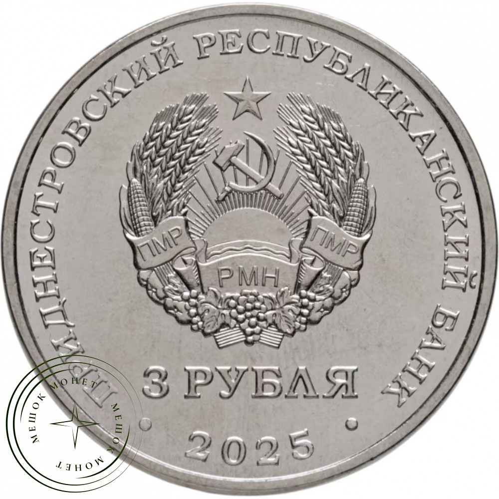 в центре – изображение Государственного герба Приднестровской Молдавской Республики, в нижней части под гербом – номинал «3 РУБЛЯ»; по кругу – надписи: вверху – «ПРИДНЕСТРОВСКИЙ РЕСПУБЛИКАНСКИЙ БАНК», внизу – год выпуска «2025».