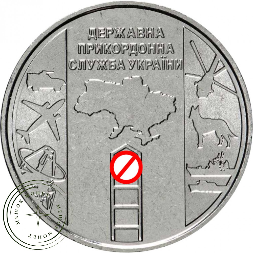 Реверс: вверху надписи – Государственная пограничная служба Украины, под которым – очертания карты Украины, внизу – символический пограничный столб, справа и слева – композиции, символизирующие деятельность Государственной пограничной службы в воздухе, на суше и на море.