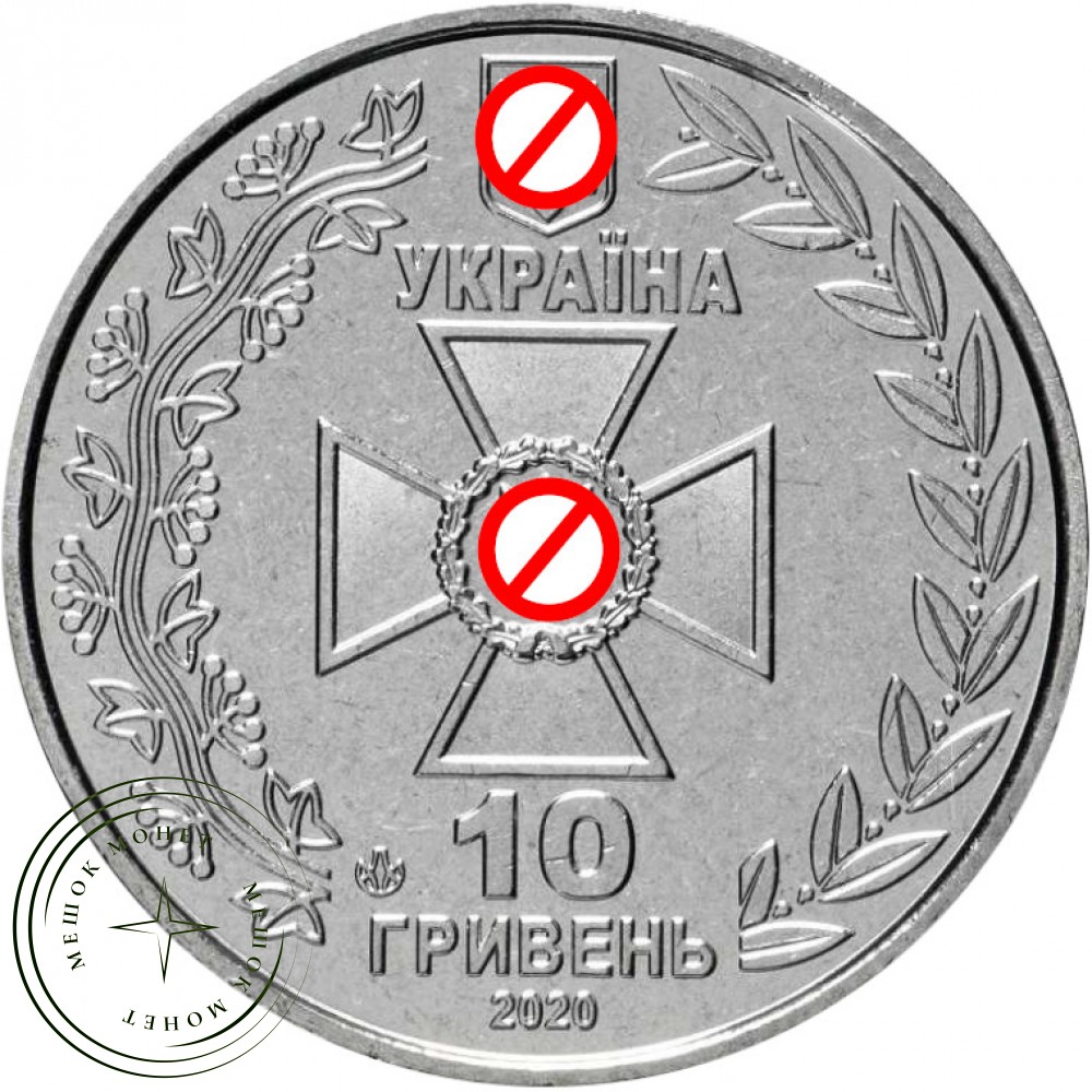 Аверс: вверху – малый Государственный Герб Украины, под которым надпись Украина; в центре – эмблема Государственной пограничной службы Украины; внизу надписи: 10/гривен/2020; стилизованные ветви: лаврова (справа), калиновая (слева). Логотип Банкнотно-монетного двора Национального банка Украины размещен внизу слева.