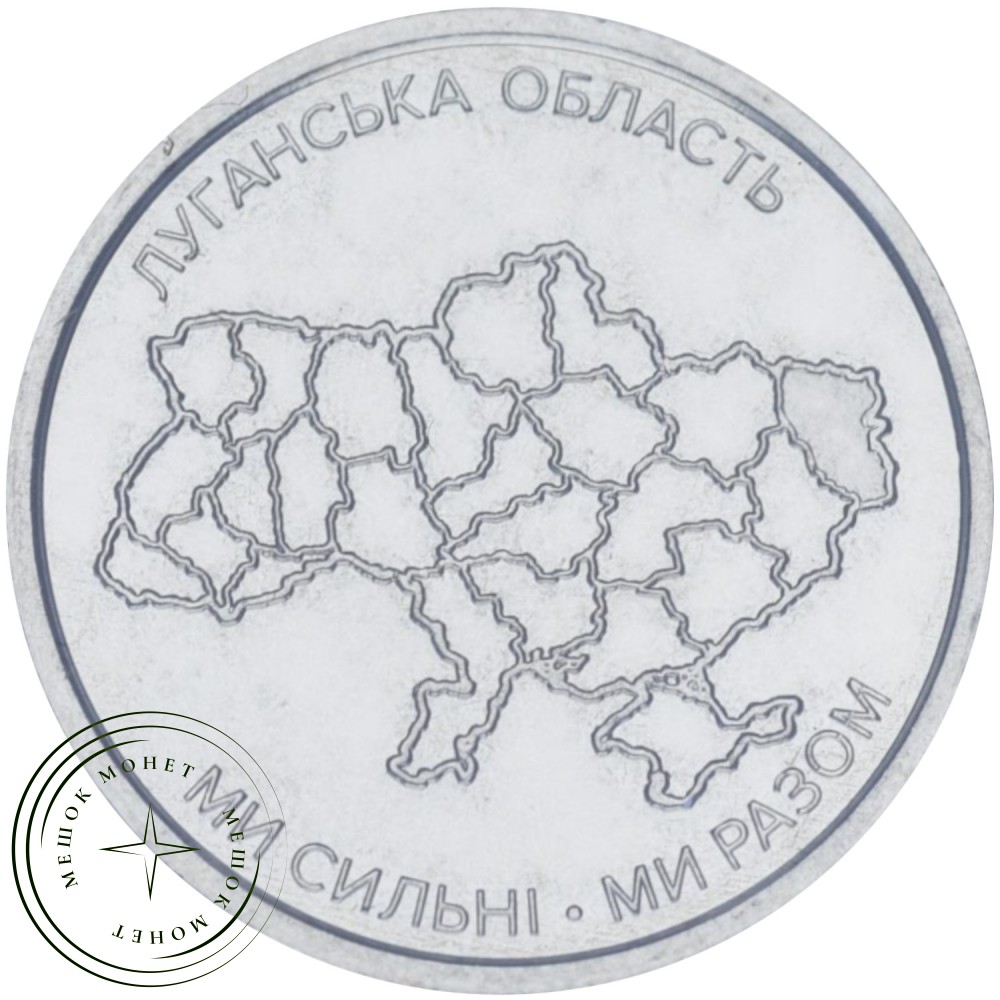 Дизайн реверса: На монете изображена стилизованная карта Украины, на которой выделены административные границы Луганской области, и надпись "ЛУГАНСЬКА ОБЛАСТЬ". В нижней части монеты полукругом расположена надпись "МИ СИЛЬНІ • МИ РАЗОМ".