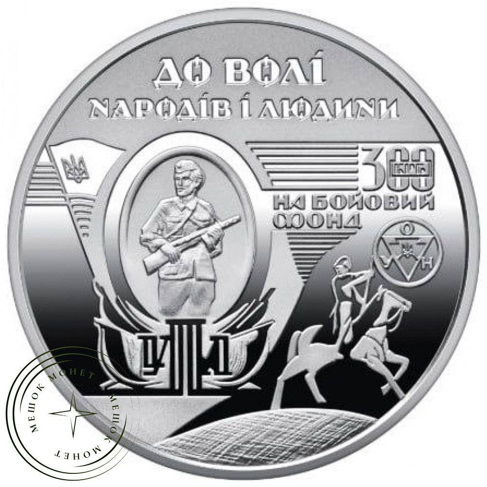 Реверс (обратная сторона): Изображена символическая композиция, стилизованная под бофон (подпольный денежный знак УПА). Композиция включает фрагменты графики Хасевича, надписи «ДО ВОЛІ! НАРОДІВ І ЛЮДИНІ» и «300 КРБ НА БОЙОВИЙ ФОНД».