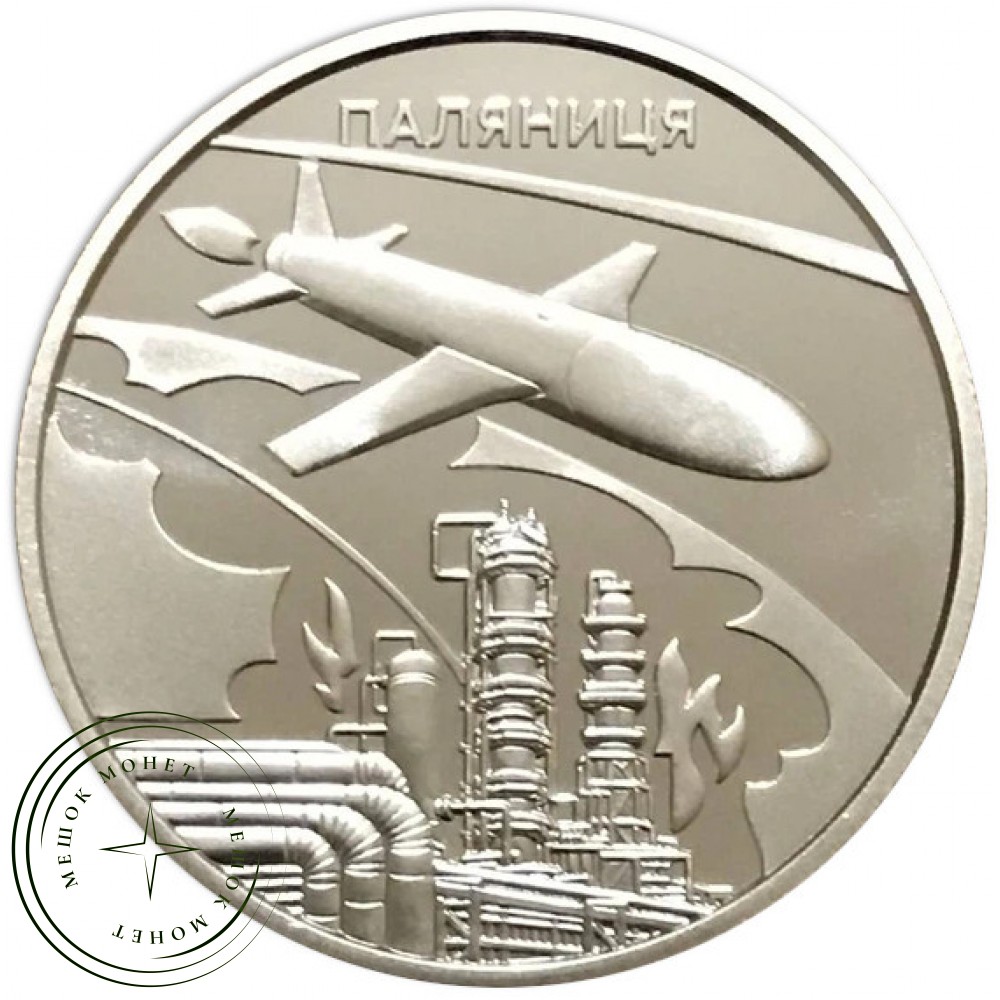 Реверс (оборотная сторона): Стилизованное изображение атаки ракеты-дрона. Вверху размещена надпись «ПАЛЯНИЦЯ».