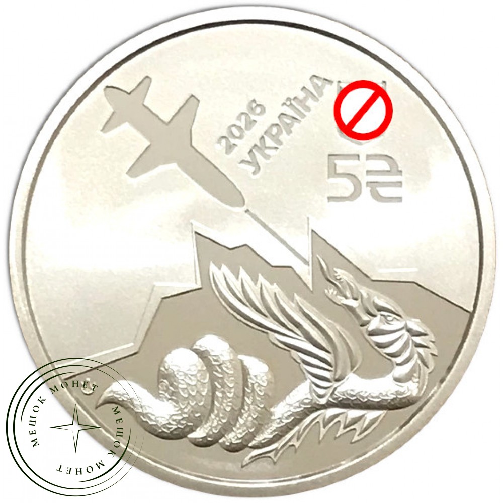 Аверс (лицевая сторона): Изображен силуэт ракеты-дрона «Паляница». В верхней части указаны год выпуска (2026), название страны «УКРАЇНА» и номинал «5₴».