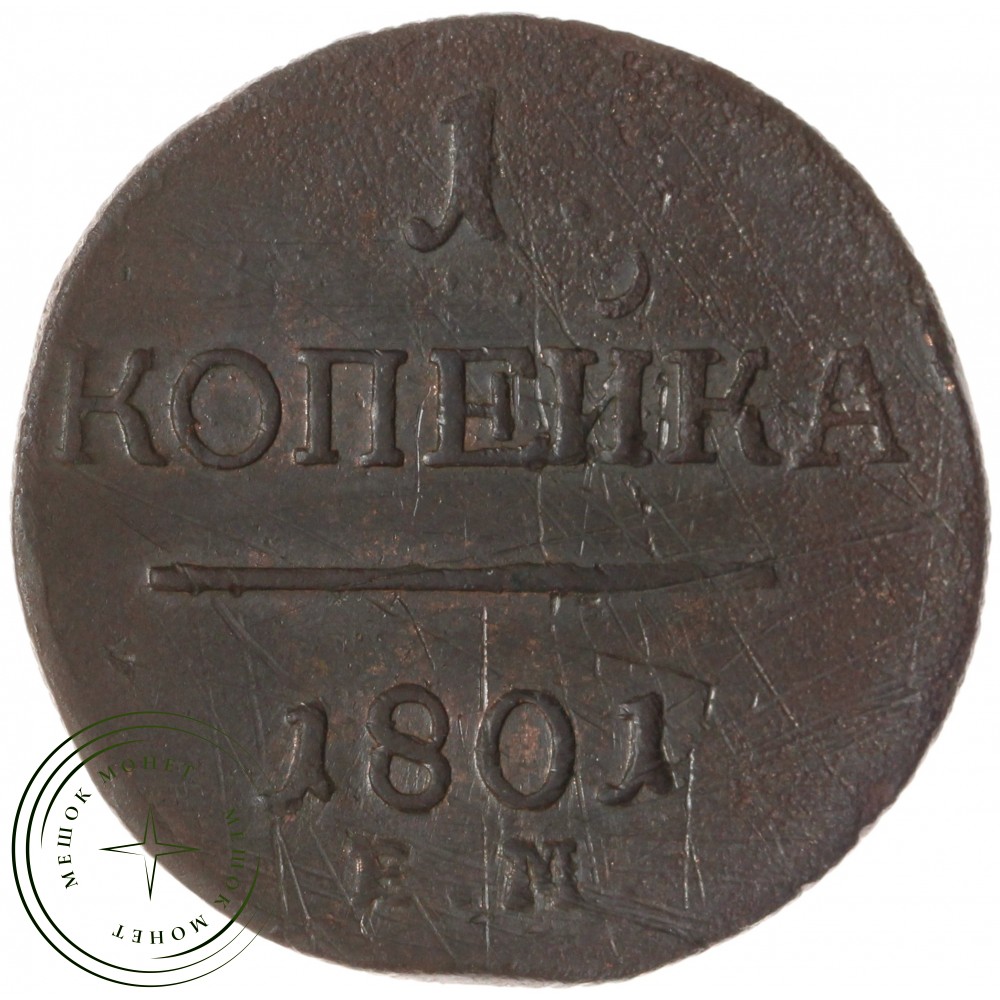 Реверс: В центре надпись — слово «КОПЕЙКА». Над надписью — цифра «1.». Под надписью — прямая черта, под ней — дата выпуска монеты «1801». Под датой обозначение Екатеринбургского монетного двора — буквы «Е.М.».