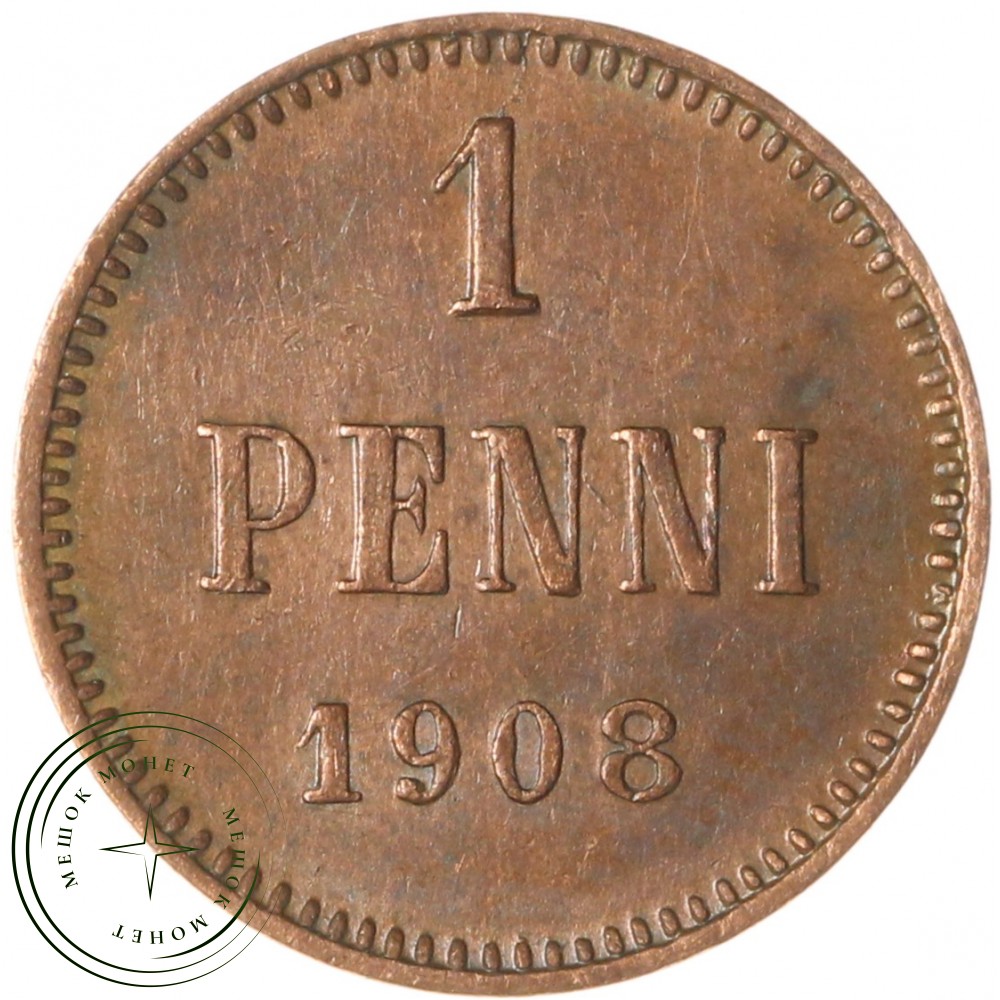 Реверс: В центре надпись в три строки: «1»│«PENNI»│«1908». По окружности канта имеются рельефные элементы, выполненные в виде зубцов.