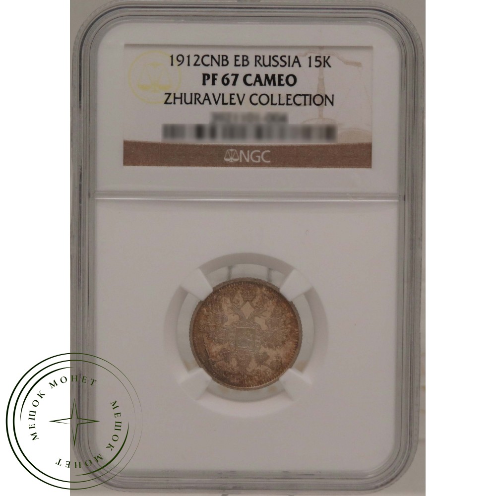 в центре указан номинал «15», ограниченный с обеих сторон звездочками. Над цифрой – Корона Российской Империи. Под цифрой номинала — слово "КОПЕЕК". Ниже, расположен декоративный разделитель в виде двух разнонаправленных фигурных линий и стилизованным из точек крестом между ними. Под разделителем — дата выпуска монеты «1912». Под цифрой даты — обозначение монетного двора «С.П.Б.». Вдоль канта, не доходя до короны, изображен венок из лавровой и дубовой ветви, которые в нижней части перевязаны лентой на узел бантом. По окружности канта имеются рельефные элементы, выполненные в виде зубцов.