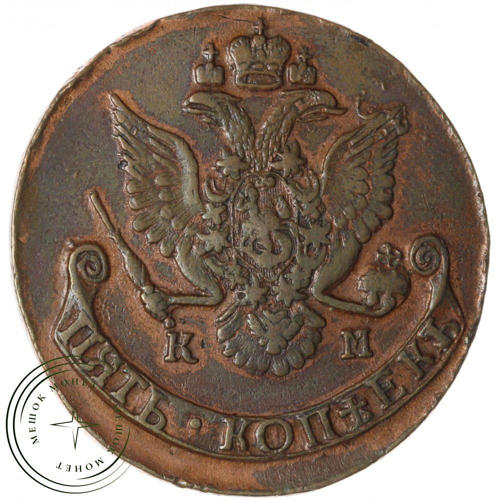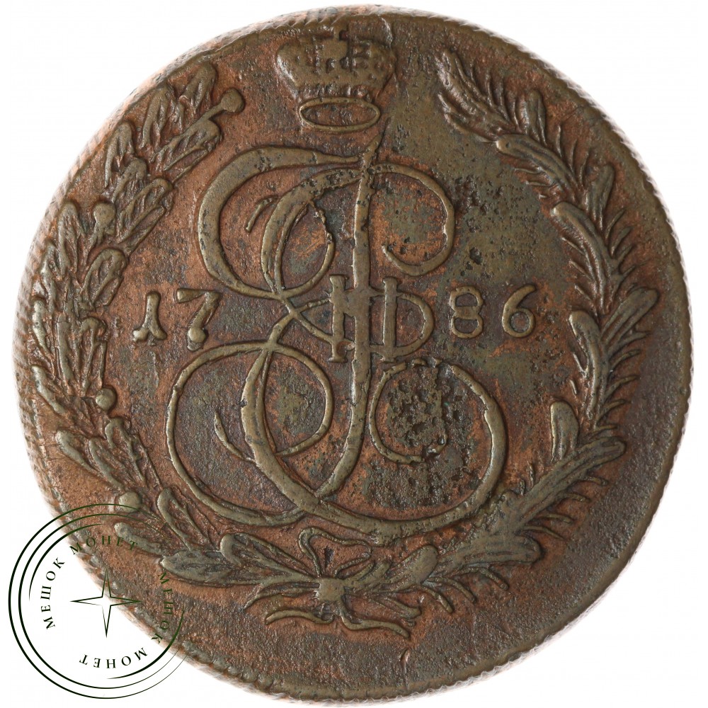 Реверс: В центре изображён вензель Екатерины II. Над вензелем — императорская корона. По обеим сторонам от вензеля цифры даты выпуска монеты: слева — «17», справа — «86» (1786 год). Вокруг центрального изображения, вдоль канта, изображён венок из лавровой и пальмовой ветвей, которые, в нижней части, перевязаны лентой на узел бантом.