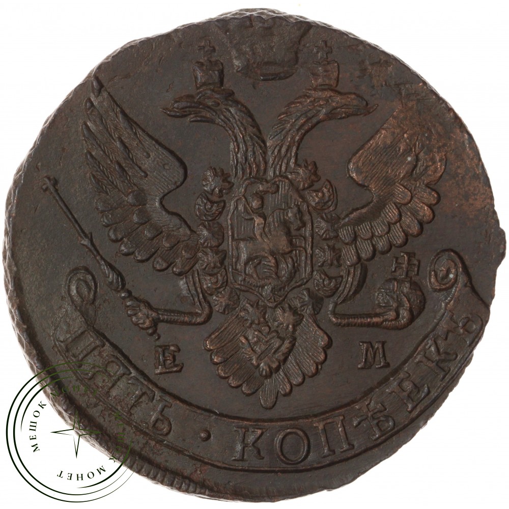 Аверс: В центре изображен Государственный Герб Российской Империи — двуглавый орёл с поднятыми вверх распущенными крыльями. Головы которого увенчаны двумя коронами, третья, большая корона над ними. На груди орла расположен Московский герб — щит с изображением Георгия Победоносца, поражающего копьём дракона. Вокруг щита орденская цепь с орденом Св. Апостола Андрея Первозванного. В правой лапе орла – скипетр, в левой – держава. Под правой лапой – буква «Е», под левой – буква «М». Обозначение Екатеринбургского монетного двора. Внизу, под центральным изображением, полукругом располагается бандероль с обозначением номинала — «ПЯТЬ•КОПѢЕКЪ».