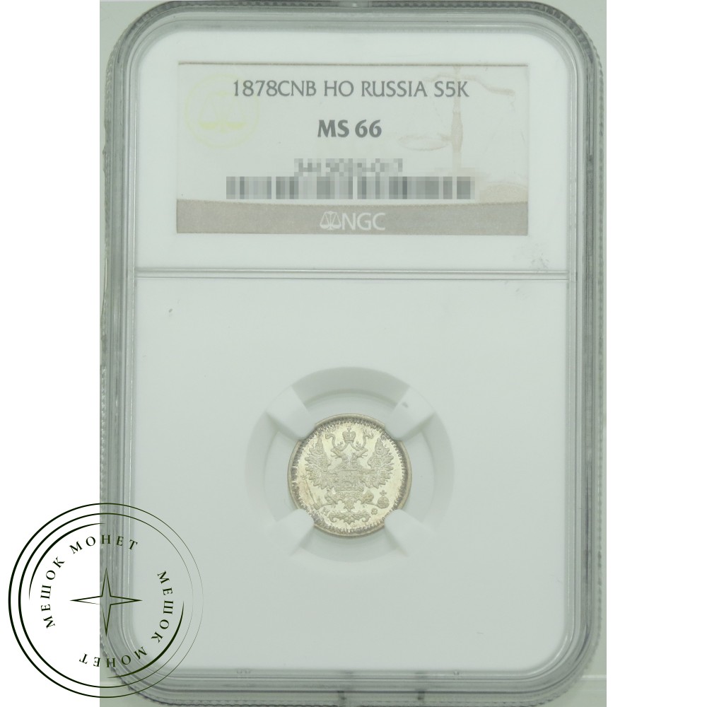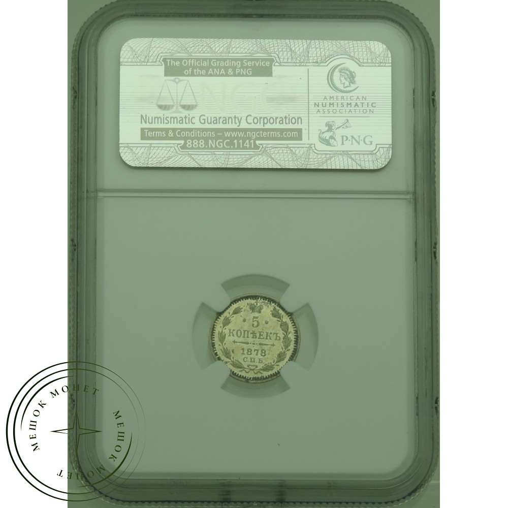 В центре указан номинал - «5», ограниченный с обеих сторон шестиконечными звездочками. Над цифрой – Корона Российской Империи. Под цифрой номинала — слово "КОПЕЕК". Ниже, расположен декоративный разделитель в виде двух разнонаправленных фигурных линий и стилизованным из точек крестом между ними. Под разделителем — дата выпуска монеты «1878». Под цифрой даты — обозначение монетного двора «С.П.Б.». Вдоль канта, не доходя до короны, изображен венок из лавровой и дубовой ветви, которые, в нижней части, перевязаны лентой на узел бантом. По окружности канта имеются рельефные элементы, выполненные в виде зубцов.