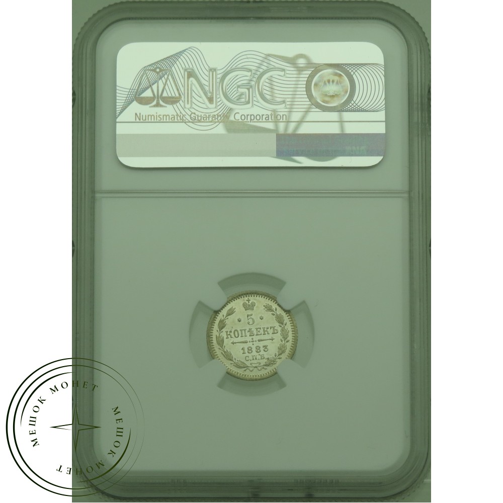 В центре указан номинал «5», ограниченный с обеих сторон шестиконечными звездочками. Над цифрой – Корона Российской Империи. Под цифрой номинала — слово "КОПЕЕК". Ниже, расположен декоративный разделитель в виде двух разнонаправленных фигурных линий и стилизованным из точек крестом между ними. Под разделителем — дата выпуска монеты «1883». Под цифрой даты — обозначение монетного двора «С.П.Б.». Вдоль канта, не доходя до короны, изображен венок из лавровой и дубовой ветви, которые в нижней части перевязаны лентой на узел бантом. По окружности канта имеются рельефные элементы, выполненные в виде зубцов.