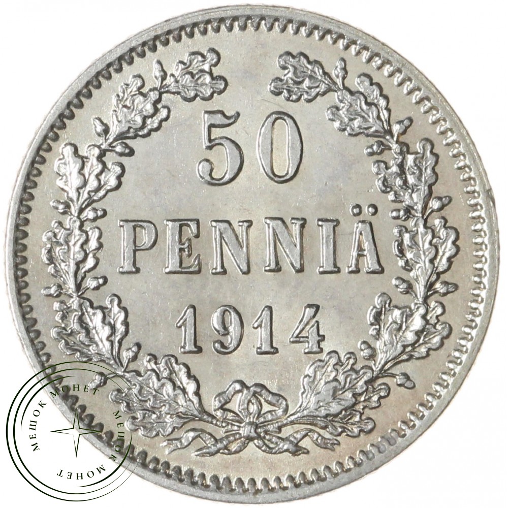 Реверс: В центре — надпись в три строки: «50»│«PENNIÄ»│«1914». Вдоль канта изображён не замкнутый венок из двух дубовых ветвей, которые, в нижней части, перевязаны лентой на узел двойным бантом. По окружности канта имеются рельефные элементы, выполненные в виде зубцов.