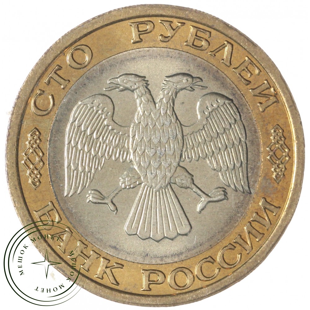 Реверс: сверху пятиконечная звезда, в центре немного смещенная вверх цифра «100» обозначающая номинал монеты, ниже слово «РУБЛЕЙ», под ним монограмма монетного двора (ММД). Внизу у края монеты год выпуска «1992». Слева колос, справа дубовая ветвь.