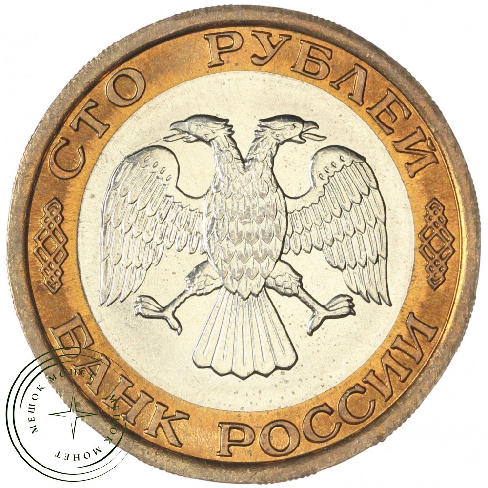 Аверс: вверху вдоль канта обозначение достоинства монеты «СТО РУБЛЕЙ» ниже справа и слева орнамент, внизу надпись «БАНК РОССИИ», в середине двуглавый орел с опущенными крыльями.