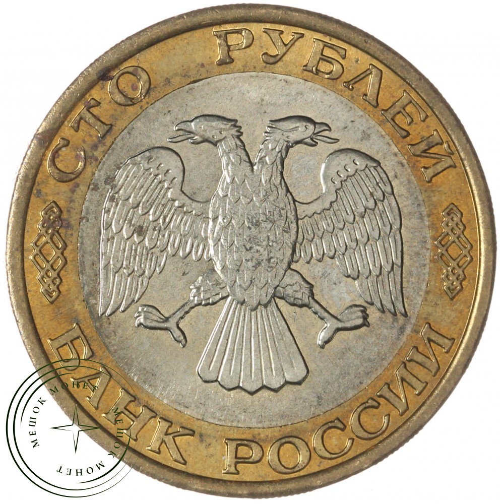Реверс: сверху пятиконечная звезда, в центре немного смещенная вверх цифра «100» обозначающая номинал монеты, ниже слово «РУБЛЕЙ», под ним монограмма монетного двора (ММД). Внизу у края монеты год выпуска «1992». Слева колос, справа дубовая ветвь.