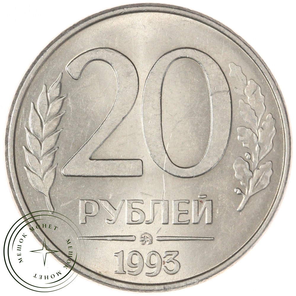 Реверс: в центре немного смещенная вверх цифра «20» обозначающая номинал монеты, ниже слово «РУБЛЕЙ», под ним монограмма монетного двора (ММД). Внизу у края монеты год выпуска «1992». Слева колос, справа дубовая ветвь.