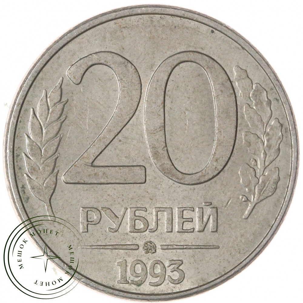 Реверс: в центре немного смещенная вверх цифра «20» обозначающая номинал монеты, ниже слово «РУБЛЕЙ», под ним монограмма монетного двора (ММД). Внизу у края монеты год выпуска «1992». Слева колос, справа дубовая ветвь.