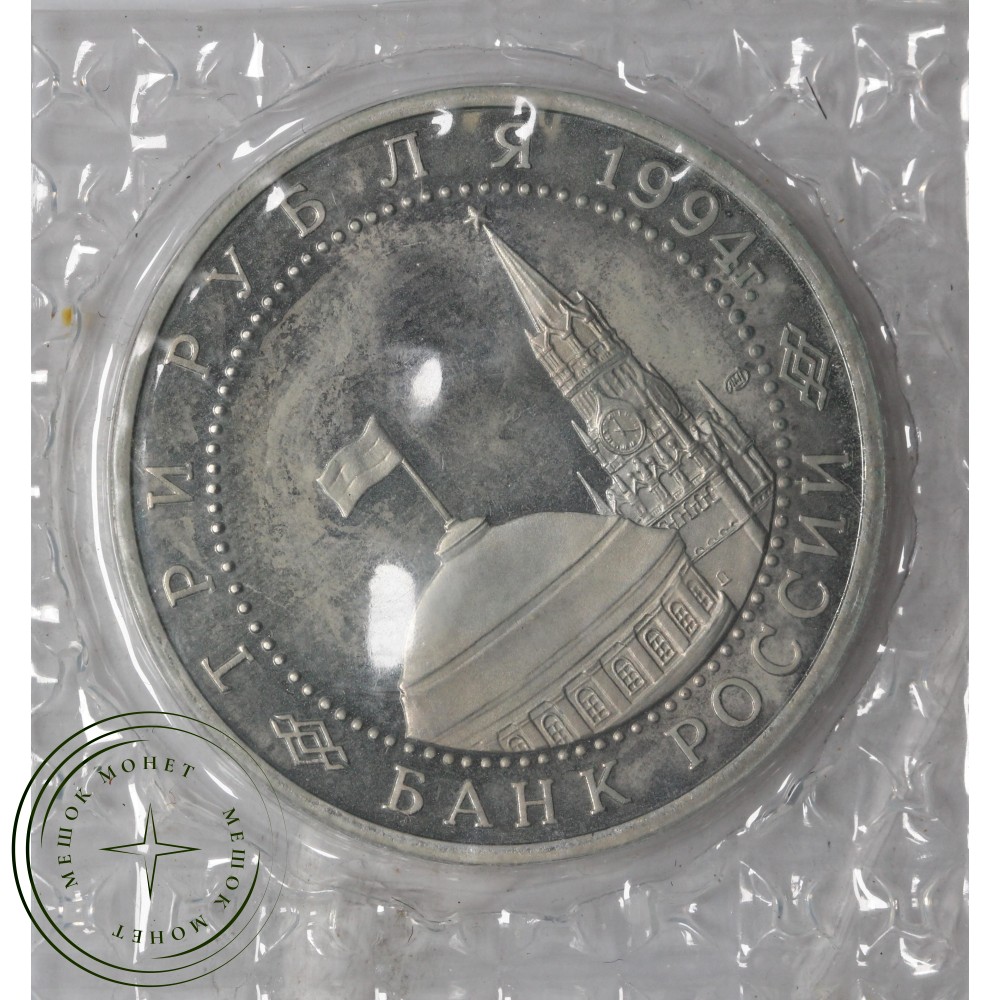 изображения фрагмента здания Кремлёвского дворца, Спасской башни Московского Кремля и товарный знак монетного двора, по окружности надписи, разделённые орнаментом: вверху — "ТРИ РУБЛЯ" "1994 г.", внизу — "БАНК РОССИИ"