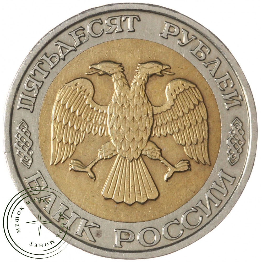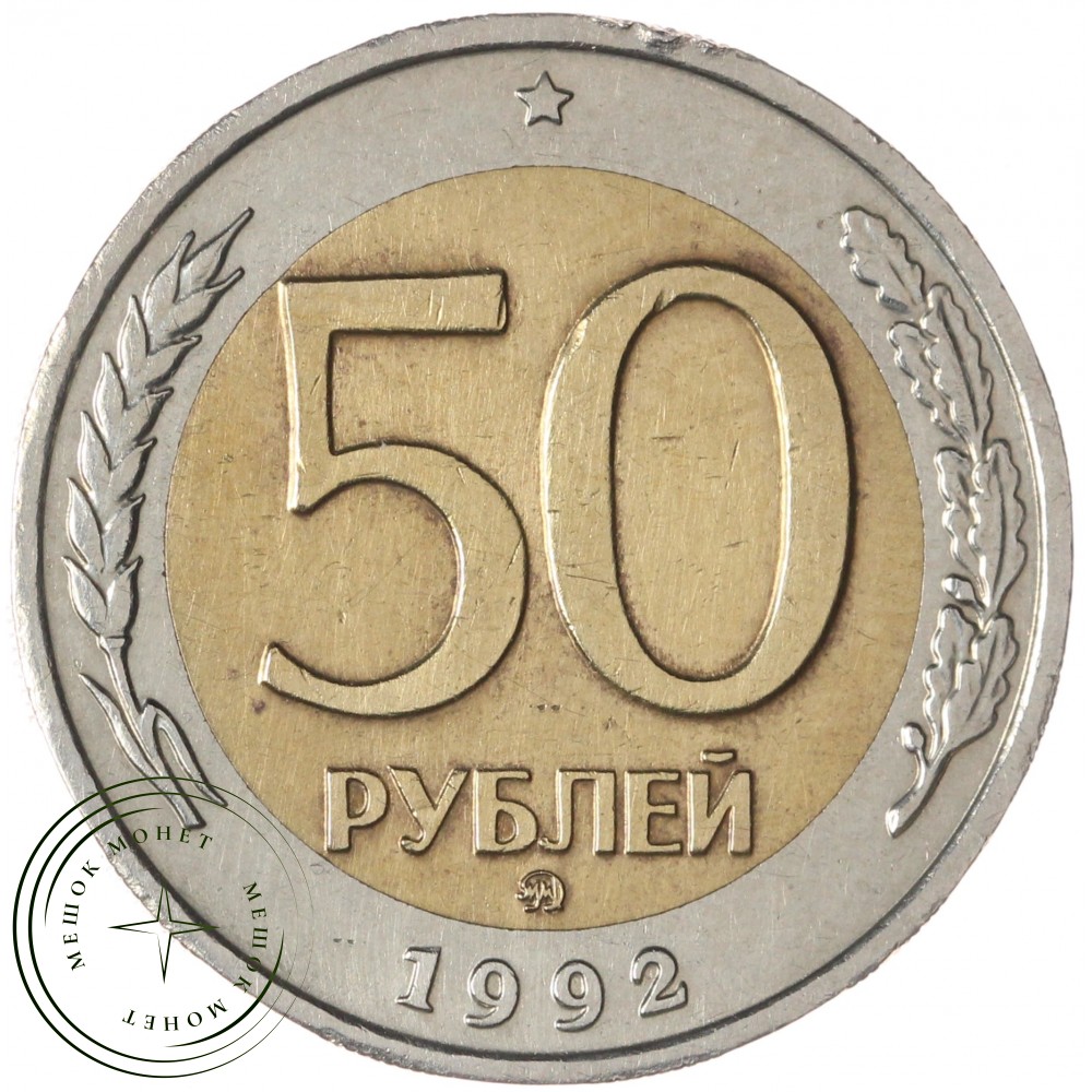 Реверс: сверху пятиконечная звезда, в центре немного смещенная вверх цифра «50» обозначающая номинал монеты, ниже слово «РУБЛЕЙ», под ним монограмма монетного двора (ММД). Внизу у края монеты год выпуска «1992». Слева колос, справа дубовая ветвь.